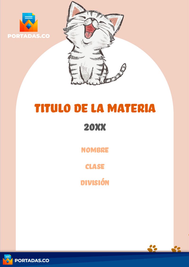 Portada kawaii para trabajos en Word, con el dibujo de un tierno gatito maullando en la parte superior y un portal de pared rosada al fondo. Además, trae un par de patitas marcadas en la esquina inferior derecha.