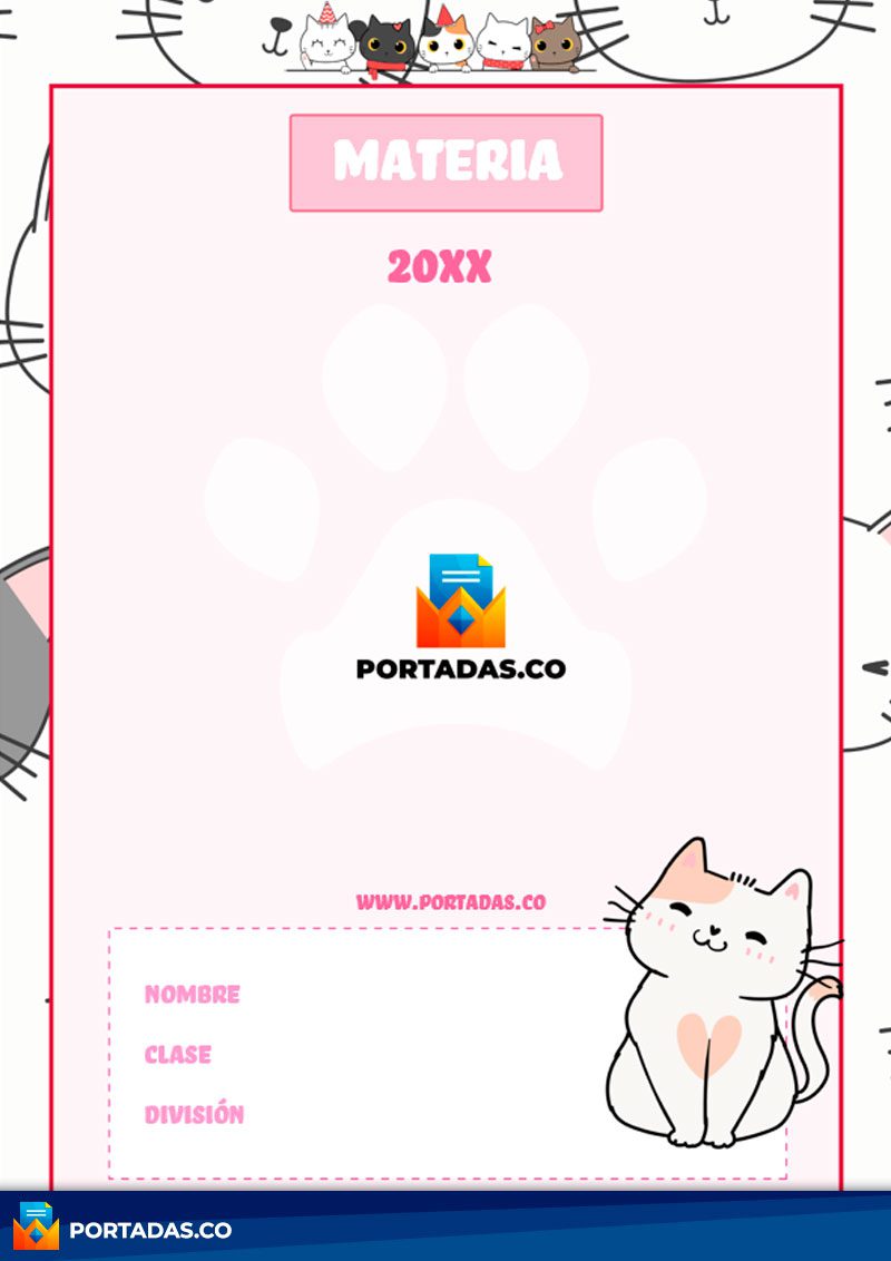 Portada para Word de estilo kawaii, que cuenta con un precioso motivo de gatos al fondo, cinco mininos en el borde superior y otra sonriendo en la esquina inferior derecha. La plantilla trae la marca de una patita en medio, además de los datos de presentación y el marco del diseño en tonos rosa.