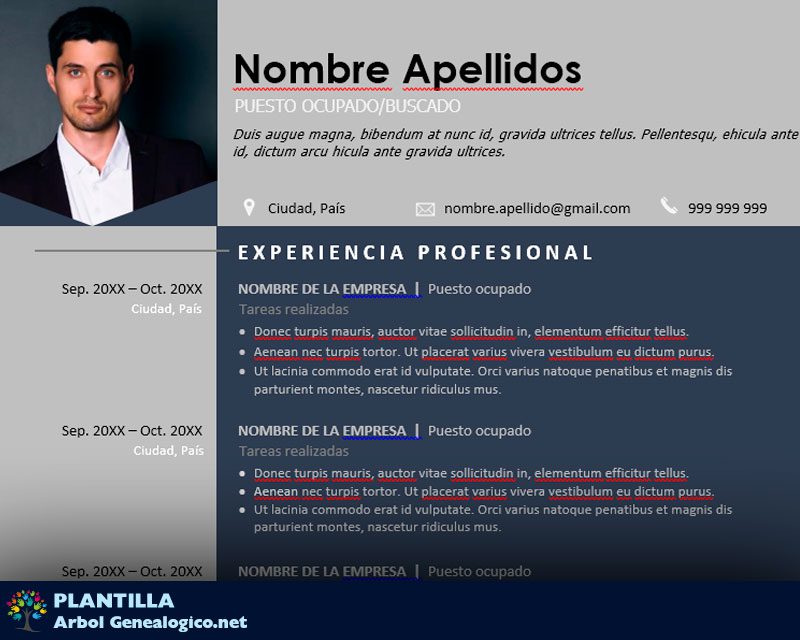 Plantilla currículo vitae simple pero que va a destacar solamente por sus colores fuerte. Cuando todas son de fondo blanco, esta plantilla tiene fondo azul, así que seguramente va a resaltar del montón.