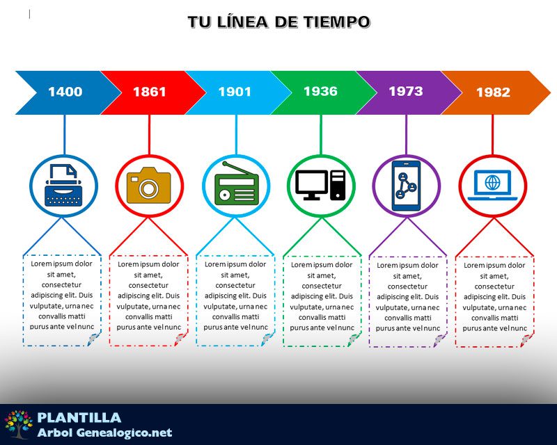 Linea de tiemplo horizontal en Word. Descarga esta plantilla colorida con los años arriba y los datos debajo de cada año.