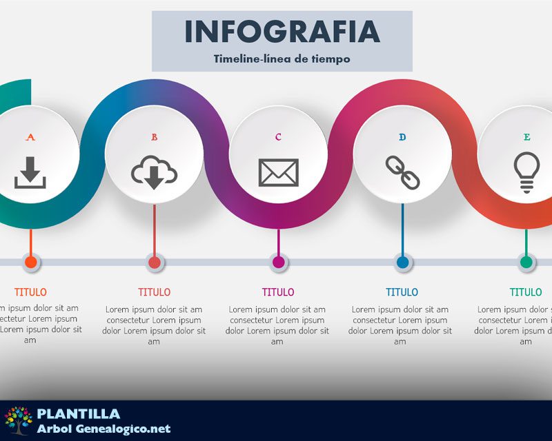 Diseño de linea de tiempo moderno con iconos. Una linea central con colores degradados y debajo la respectiva linea con sus puntos y textos. Descárgala gratis.