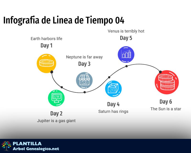Infografía linea de tiempo en formato PowerPoint para descargar, completar los datos y luego hacer tu presentación. Diseño visualmente limpio con circulos de colores. Ideal para hacer linea de tiempo de pocos de una semana.