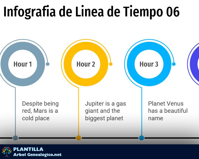 Infografía linea de tiempo en formato PowerPoint para descargar, completar los datos y luego hacer tu presentación. Diseño simple con circulos de colores y linea que lleva a su correspondiente texto.