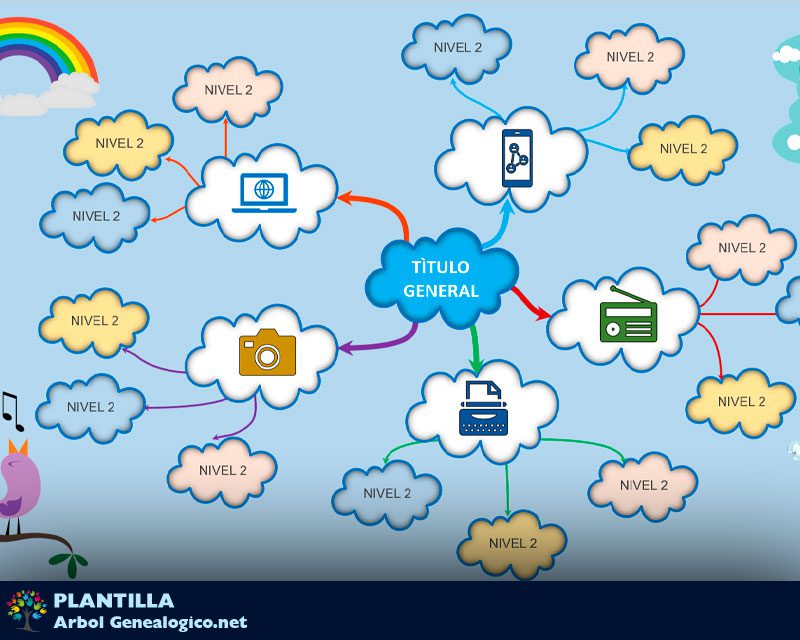 Descargar la plantilla de Mapa Mental en PowerPoint para personalizar este diseño de nubes en diferentes colores que te ayudaran a lograr una mejor presentación de tus ideas.