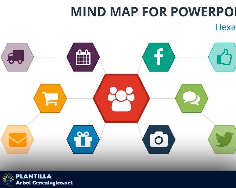 Descarga esta moderna plantilla de Mapa Mental para Power Point con hexágonos que representan las distintas ideas que se desprenden de tu proyecto principal.