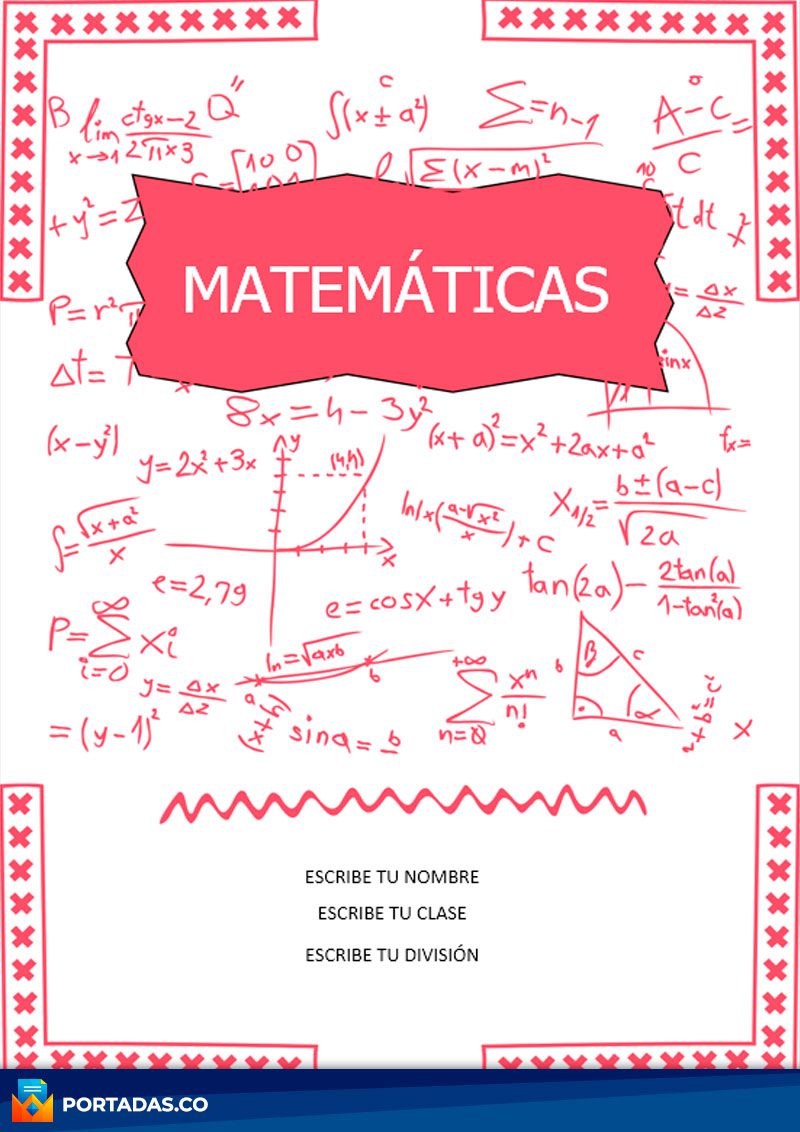 Esta plantilla para hacer tu portada de matemáticas tiene un fondo que simula una pizarra con decenas de datos y cálculos complejos, todo en color rosa y un marco en el mismo tono.