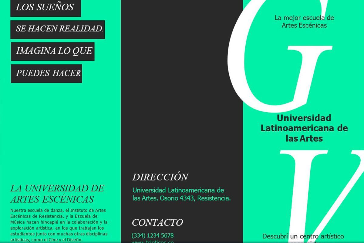 Tríptico para temas educativos elaborado en Word. Está ideado para cualquier universidad de artes y cuenta con fondos en color negro y azul turquesa.
