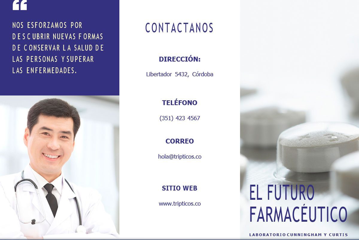 Tríptico preparado en formato Word para el área de la medicina relacionada con algún laboratorio farmacéutico. Está creado a partir de fondos que llevan los típicos colores blancos y azules de las clínicas u hospitales, combinados con la foto de un doctor y la imagen de un blíster pastillas.