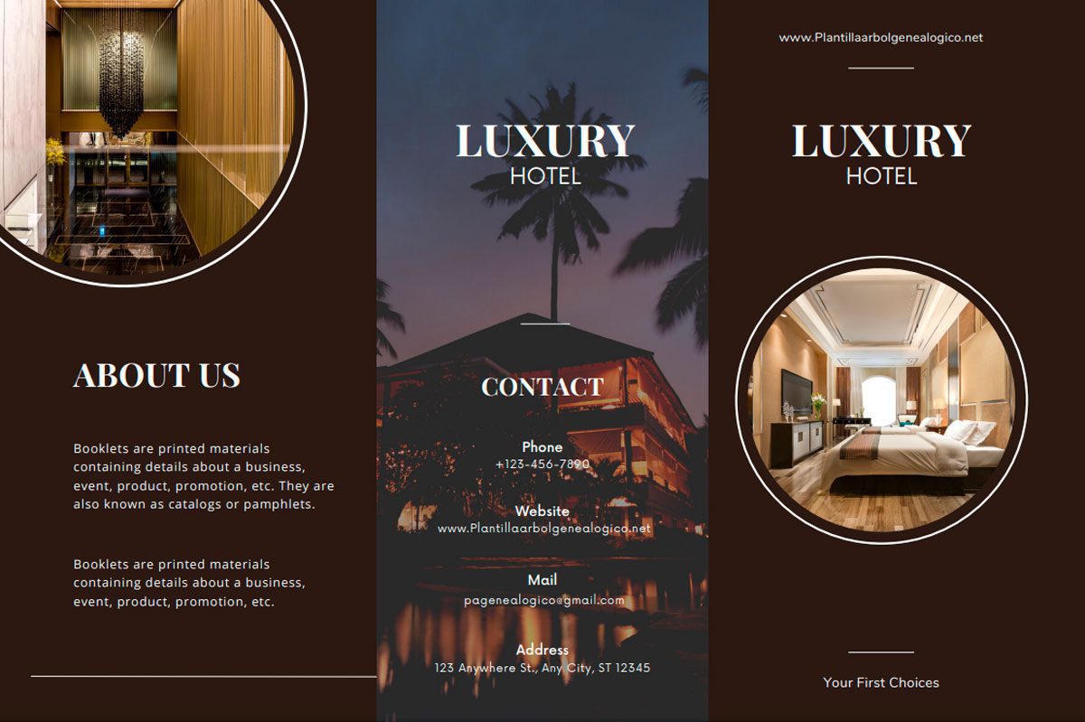 Portada: La portada debe tener una imagen impresionante del hotel que llame la atención de los posibles huéspedes. Además, se debe incluir el nombre del hotel, su logotipo y una breve descripción que destaque sus principales características y atractivos.