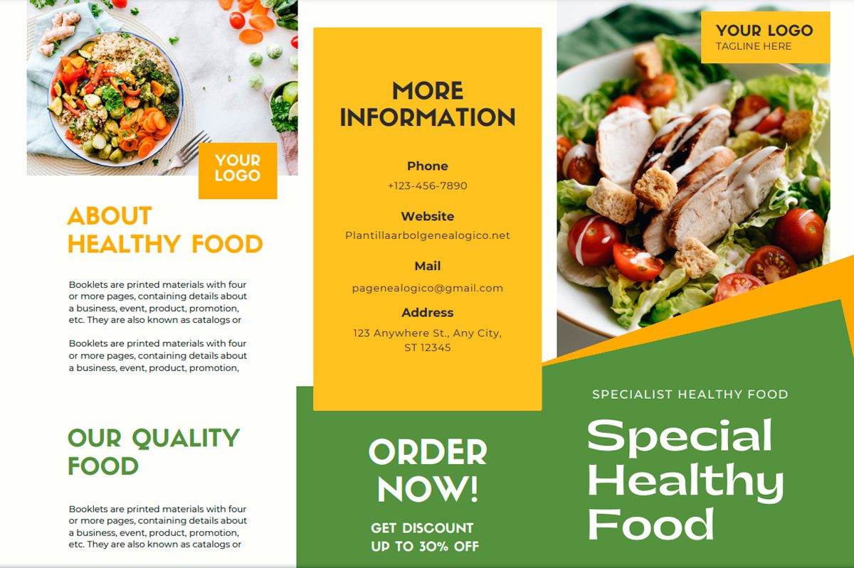 En la primera página del tríptico, encontrarás una introducción a nuestro restaurante y nuestra filosofía de ofrecer opciones de comida saludable y sostenible. También se proporcionará una descripción general de nuestras opciones de menú, que incluyen opciones veganas, vegetarianas y orgánicas.