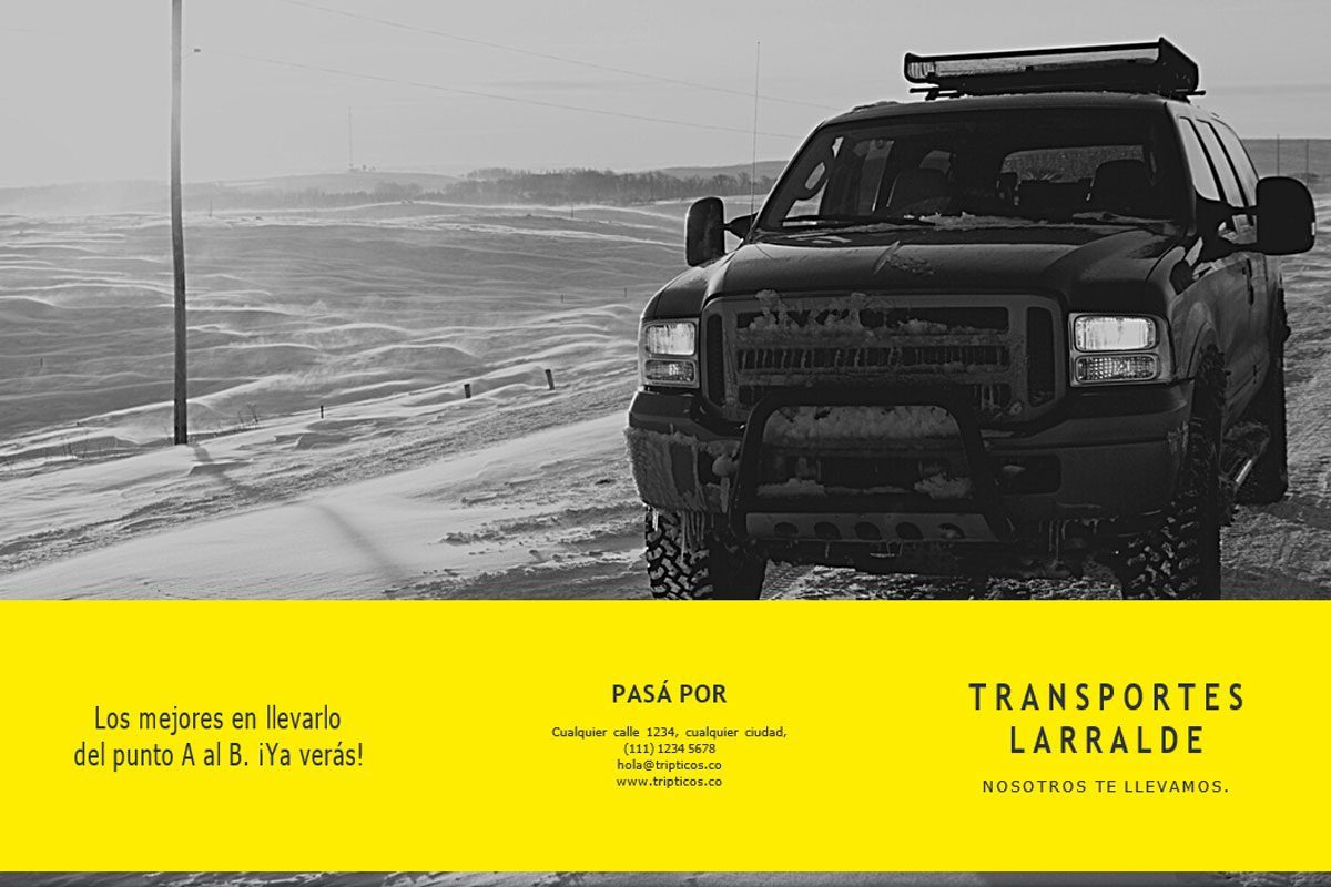 Tríptico Word para turismo, con un diseño pensado en una empresa de transporte y aventura. La plantilla presenta la foto de una lujosa camioneta todo terreno que abarca las partes media y superior de las tres caras externas del documento, encima de toda la información concerniente a la agencia de viajes terrestres, la cual destaca en un llamativo fondo de color amarillo.