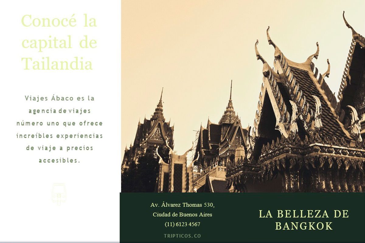 Tríptico de turismo preparado en formato Word y enfocado específicamente en viajes a Bangkok. Posee una imagen que muestra estructuras propias de la mencionada ciudad tailandesa, abarcando dos de las tres caras del documento, el cual también cuenta con distintos tonos de color verde para adornar su diseño.